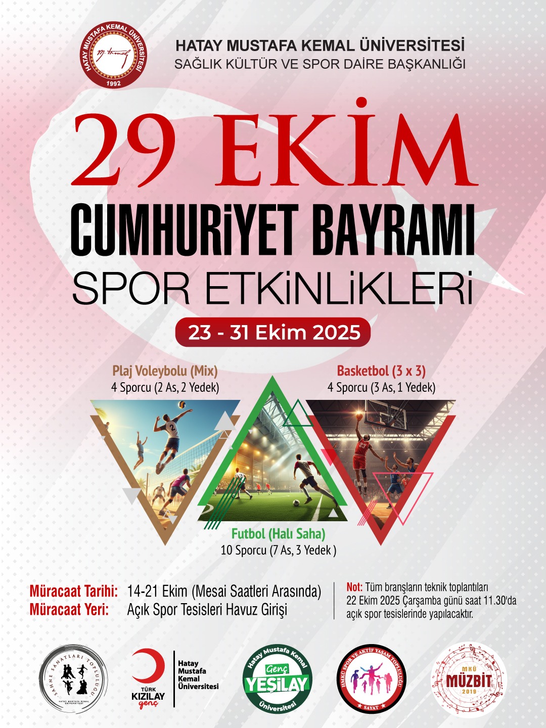 29 Ekim Cumhuriyet Bayramı Spor Etkinlikleri "29 Ekim Cumhuriyet Bayramı Sportif Etkinlikleri' çerçevesinde Masa Tenisi, Halı Saha Futbol, 3*3 Basketbol ve Plaj Voleybolu turnuvası düzenlenecektir. Müracaatlar 14-21 Ekim tarihleri arasında Açık Spor Tesisleri Havuz girişinde yapılacaktır. : SAĞLIK KÜLTÜR VE SPOR DAİRE BAŞKANLIĞI tarafından yayınlanmıştır. Birim Duyuruları için tıklayınız. : 20 Ekim 2025 - 04 Aralık 2026 Tweet