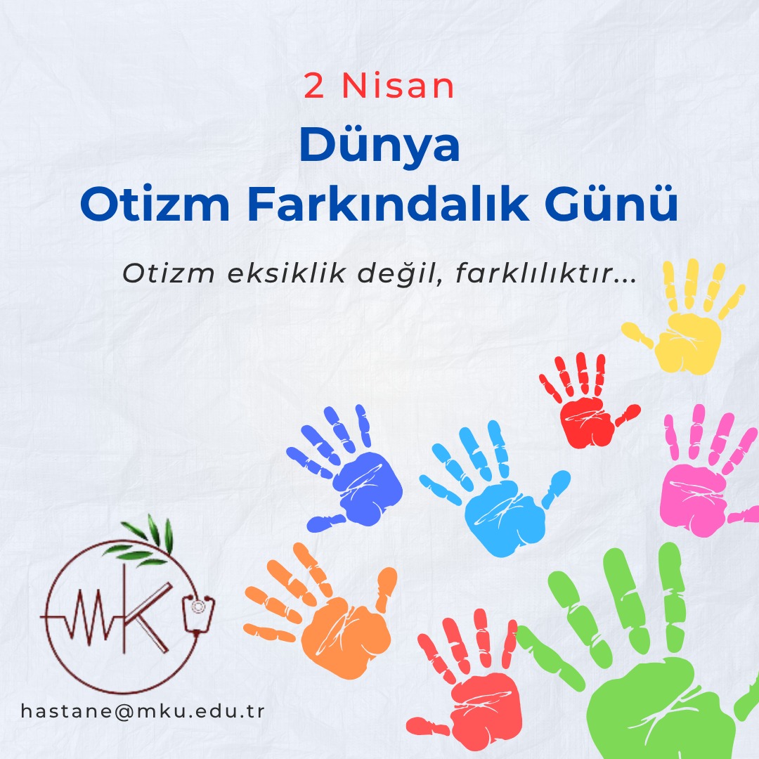 OTİZM Farkındalık Günü : Mustafa Kemal Üniversitesi Hastanesi tarafından yayınlanmıştır. Birim Duyuruları için tıklayınız. : 02 Nisan 2026 - 12 Nisan 2026 Tweet