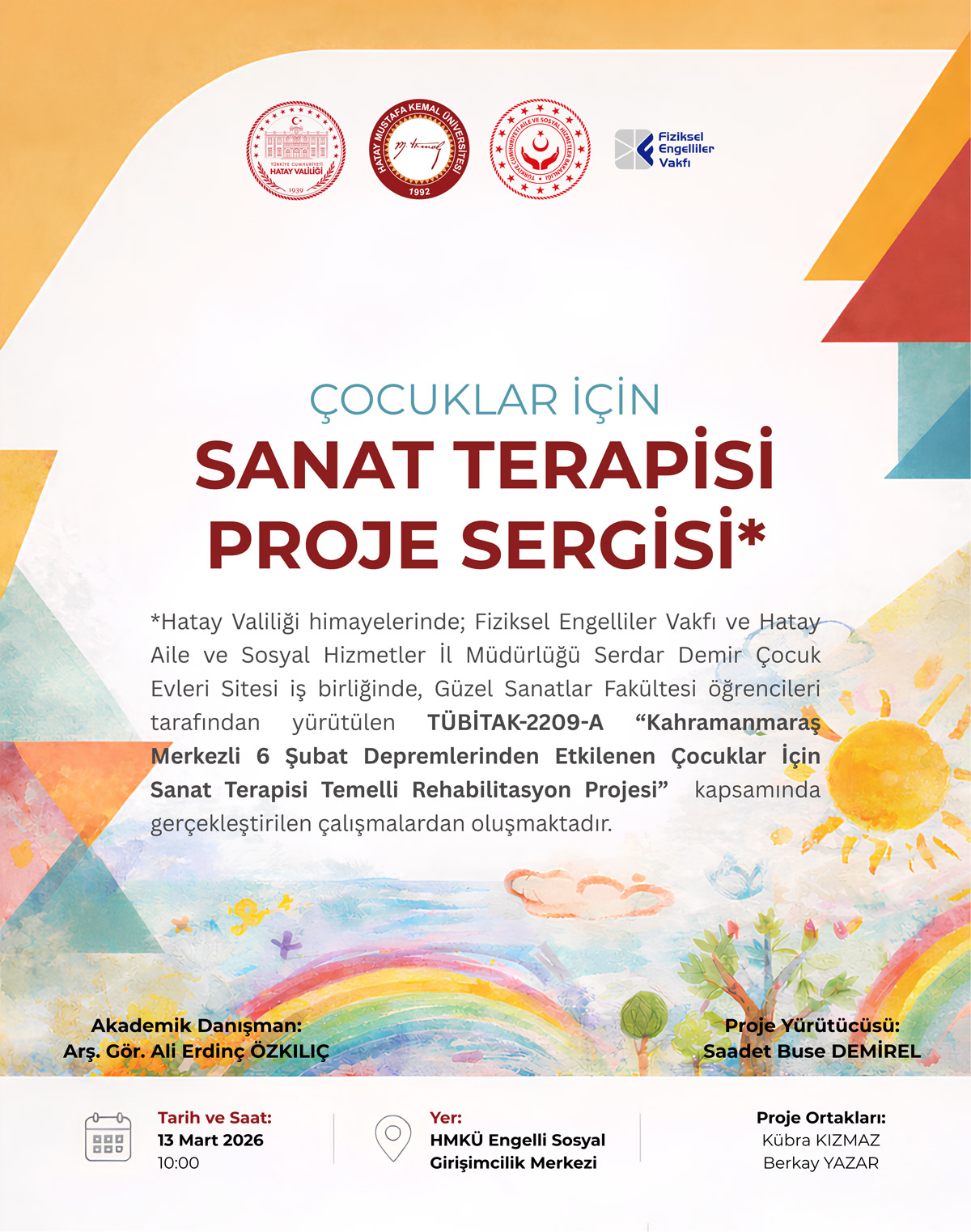 *Hatay Valiliği himayelerinde; Fiziksel Engelliler Vakfı ve Hatay Aile ve Sosyal Hizmetler İl Müdürlüğü Serdar Demir Çocuk Evleri Sitesi iş birliğinde, Güzel Sanatlar Fakültesi öğrencileri tarafından yürütülen TÜBİTAK-2209-A "Kahramanmaraş Merkezli 6 Şubat Depremlerinden Etkilenen Çocuklar İçin Sanat Terapisi Temelli Rehabilitasyon Projesi" kapsamında gerçekleştirilen çalışmalardan oluşan sergiye davetlisiniz.