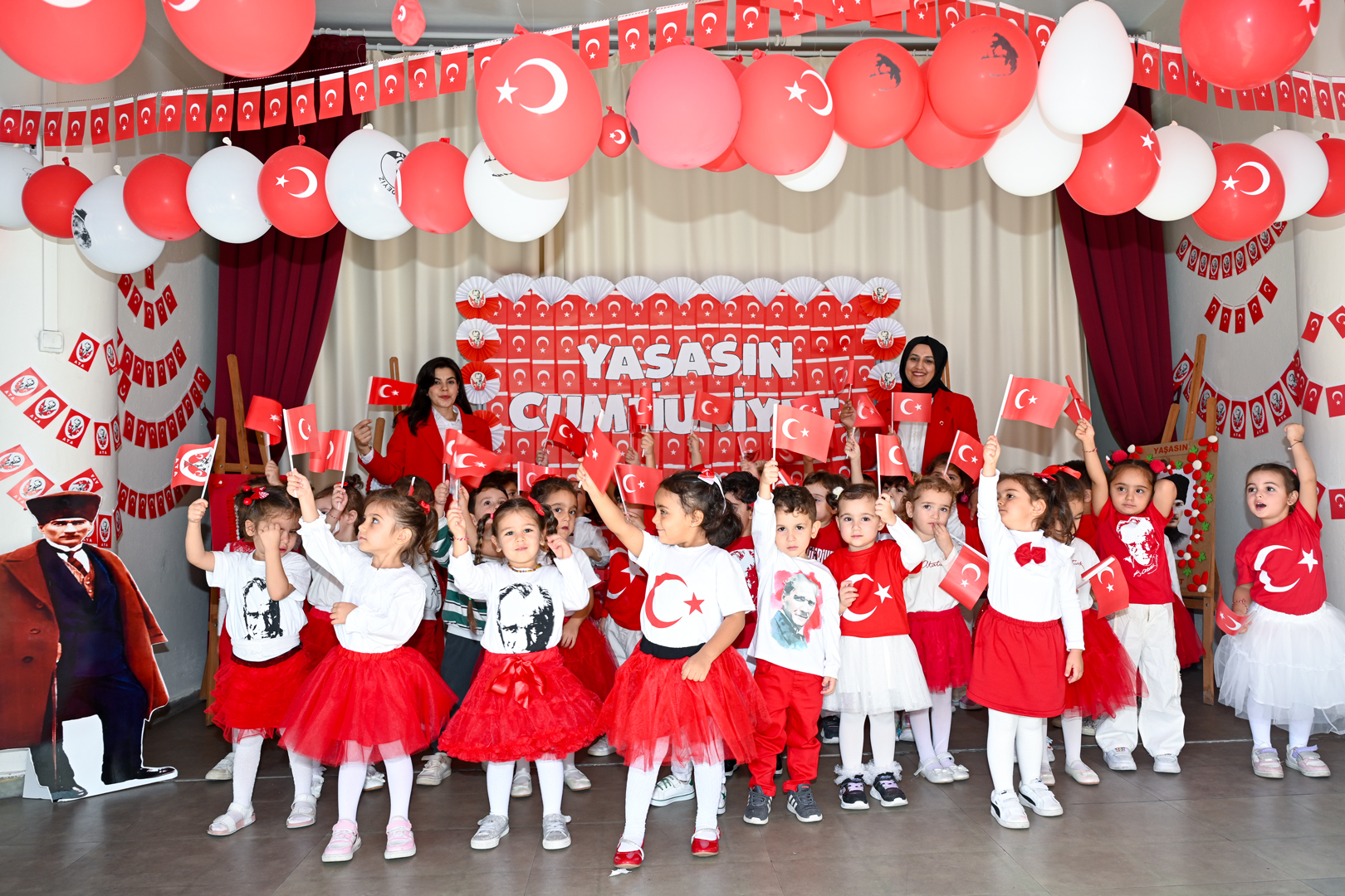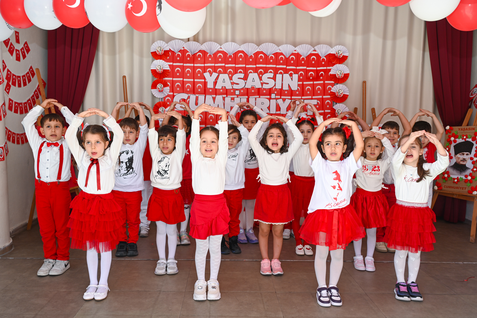 Etkinlikte minik öğrenciler, öğretmenleri eşliğinde bayrak gösterileri sundu, Cumhuriyet temalı şarkılar seslendirdi. Kreş bahçesinde gerçekleştirilen kutlamalarda, öğrencilerin hazırladığı gösteriler renkli görüntülere sahne oldu.