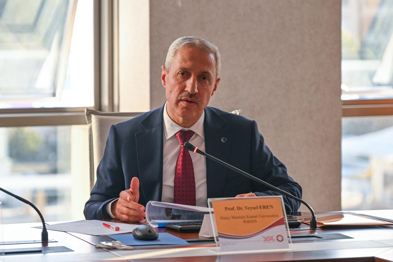 Hatay Mustafa Kemal Üniversitesi Senato Toplantı Salonunda YÖK Başkanımız Prof. Dr. Erol Özvar’ın Başkanlığında gerçekleşen Bölge Üniversite Rektörleri Toplantısında sunum yapan Rektörümüz Prof. Dr. Veysel Eren, Üniversitemizin son 3 yılını kapsayan yeniden ihya ve inşa çalışmalarını anlattı.